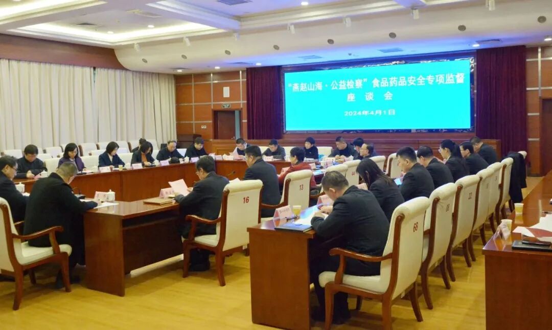 为广泛听取社会各界意见建议,科学精准开展“燕赵山海·公益检察”之食品药品安全专项监督,4月1日,唐山市检察院召开“燕赵山海·公益检察”食品药品安全专项监督座谈会。市人大常委会监察司法工委主任、市政协社会法制委员会主任;部分省市人大代表、政协委员;人民监督员、特邀检察官助理、“益心为公”志愿者及市公安局、市农业农村局、市卫生健康委员会、市市场监督管理局有关领导应邀参加座谈。