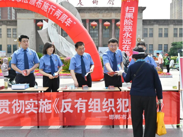 为进一步学习、宣传和贯彻反有组织犯罪法,不断提高人民群众对涉黑涉恶有组织犯罪的认知,增强法治意识,5月16日,邯郸市检察机关以“扬正气、群防治、促发展”为主题组织开展了反有组织犯罪法宣传活动。活动中,全市检察干警走进广场、街道、金融机构、学校等场所,通过悬挂条幅、张贴标语、发放宣传册、现场咨询解答等形式,向群众讲解反有组织犯罪法的起草背景、重要意义、重点内容等相关知识,进一步凝聚共同参与扫黑除恶的社会力量。