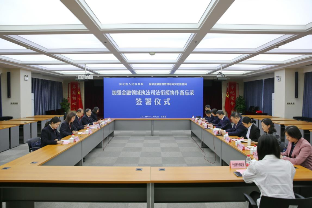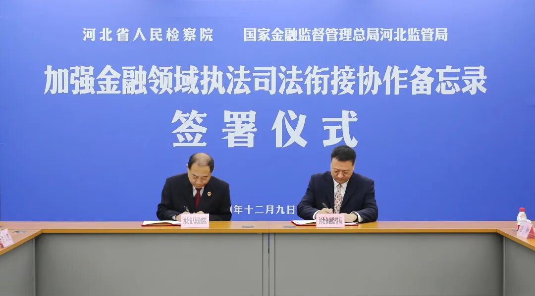 12月9日,省检察院、河北金融监管局联合召开加强金融领域执法司法衔接协作备忘录签署仪式暨首次工作交流会,围绕惩治和预防涉金融机构犯罪、非法金融活动犯罪、金融腐败犯罪等加强协作配合,进一步凝聚维护金融安全工作合力,更好服务金融高质量发展。河北金融监管局党委书记、局长王文刚,省检察院党组成员、副检察长贾志宏出席并讲话。