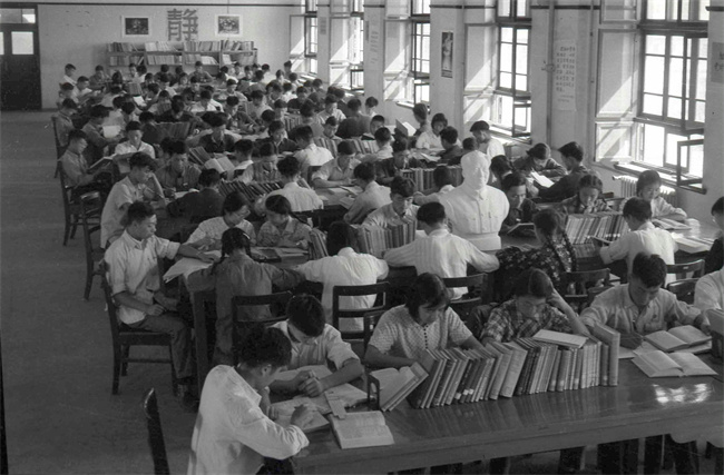 1959年,学生们在西迁后的交大校园图书馆阅览室内学习(资料照片)。新华社发