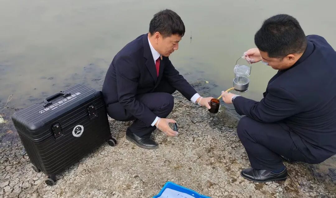 邢台市信都区检察院干警对直排污水开展取样检测。