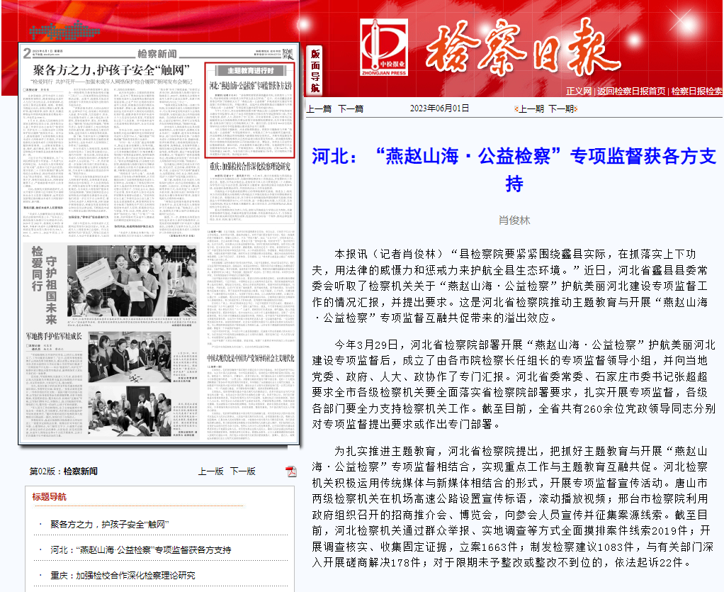 为扎实推进主题教育,河北省检察院提出,把抓好主题教育与开展“燕赵山海·公益检察”专项监督相结合,实现重点工作与主题教育互融共促。河北检察机关积极运用传统媒体与新媒体相结合的形式,开展专项监督宣传活动。唐山市两级检察机关在机场高速公路设置宣传标语,滚动播放视频;邢台市检察院利用政府组织召开的招商推介会、博览会,向参会人员宣传并征集案源线索。截至目前,河北检察机关通过群众举报、实地调查等方式全面摸排案件线索2019件;开展调查核实、收集固定证据,立案1663件;制发检察建议1083件,与有关部门深入开展磋商解决178件;对于限期未予整改或整改不到位的,依法起诉22件。