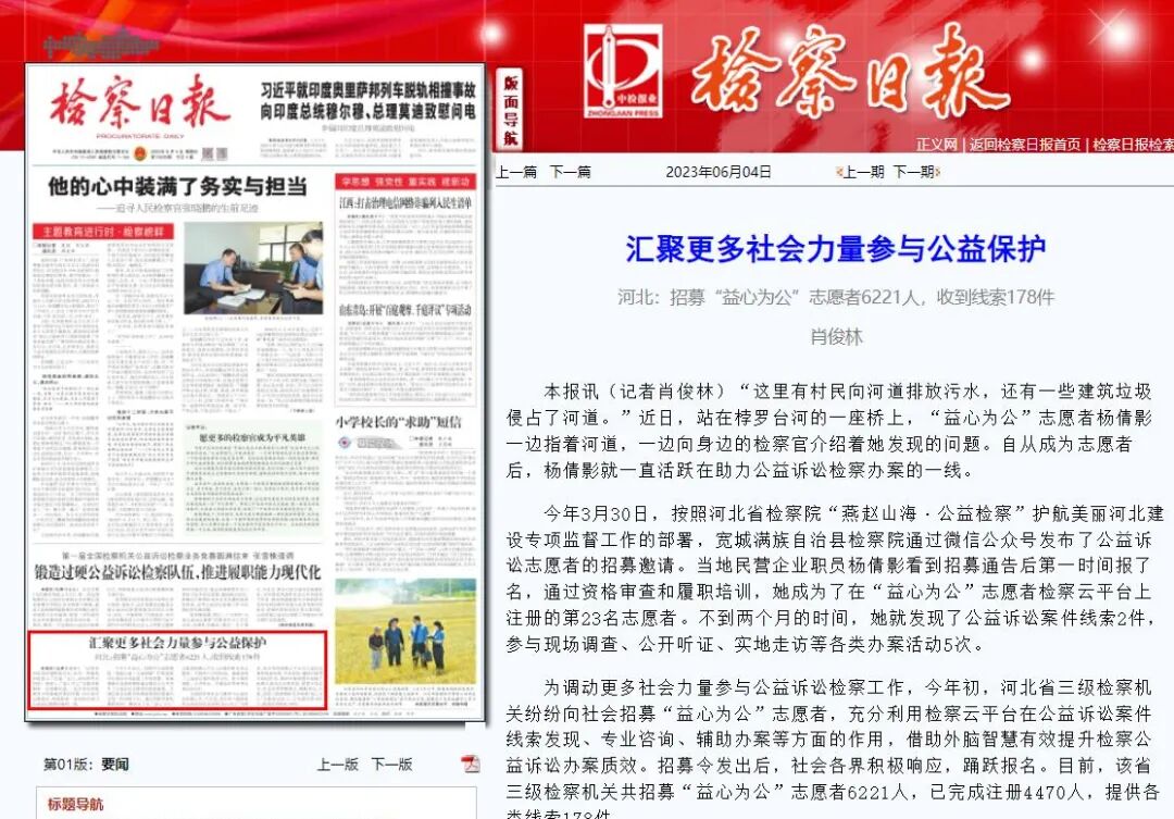 为调动更多社会力量参与公益诉讼检察工作,今年初,河北省三级检察机关纷纷向社会招募“益心为公”志愿者,充分利用检察云平台在公益诉讼案件线索发现、专业咨询、辅助办案等方面的作用,借助外脑智慧有效提升检察公益诉讼办案质效。招募令发出后,社会各界积极响应,踊跃报名。目前,该省三级检察机关共招募“益心为公”志愿者6221人,已完成注册4470人,提供各类线索178件。