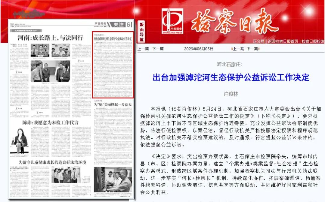5月24日,河北省石家庄市人大常委会出台《关于加强检察机关滹沱河生态保护公益诉讼工作的决定》(下称《决定》),要求根据滹沱河上中下游不同区域生态保护治理需要,充分发挥公益诉讼检察制度优势,依法行使检察权,以案促治,督促行政机关严格按照法定权限和程序规范执法。对行政机关不落实检察建议的,及时通报。符合提起公益诉讼条件的,依法提起公益诉讼。
