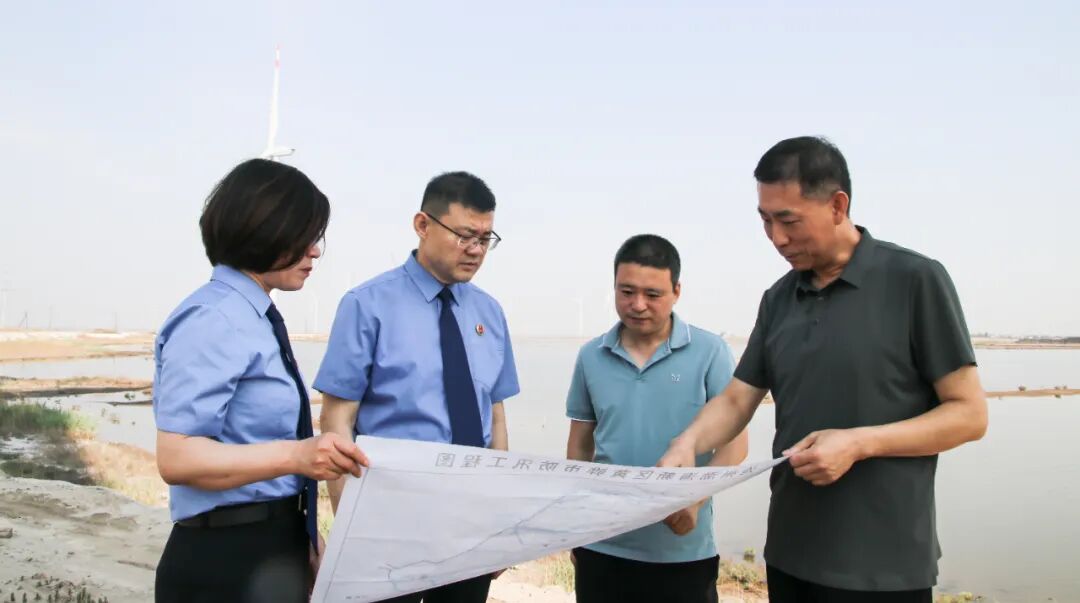 黄骅市检察院与当地政府人员一同前往捷地减河入海口现场查看2000余亩违建虾池治理情况。