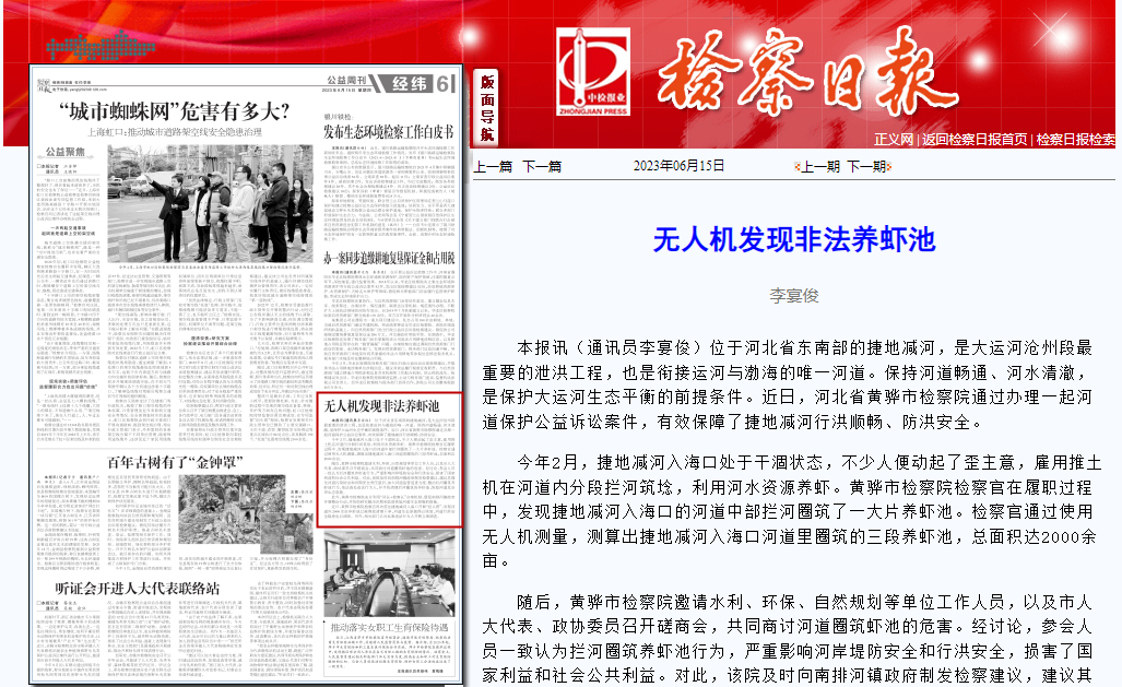 随后,黄骅市检察院邀请水利、环保、自然规划等单位工作人员,以及市人大代表、政协委员召开磋商会,共同商讨河道圈筑虾池的危害。经讨论,参会人员一致认为拦河圈筑养虾池行为,严重影响河岸堤防安全和行洪安全,损害了国家利益和社会公共利益。对此,该院及时向南排河镇政府制发检察建议,建议其强化河道污染防治和汛期安全责任意识,加大河道监管巡查力度,整治拦河圈筑养虾池行为,依法查处违法行为人,并尽快清理拦河圈筑的养虾池,恢复河道及沿岸生态原貌。
