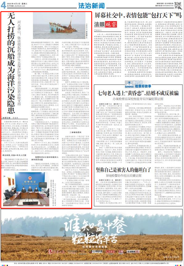 “曹妃甸海域有个沉船,都4年了还没人打捞。”2020年7月,唐山市检察院接到群众举报,担心海水腐蚀会造成船舶漏油,污染海洋环境,影响涉案海域渔民捕捞作业及航行安全。