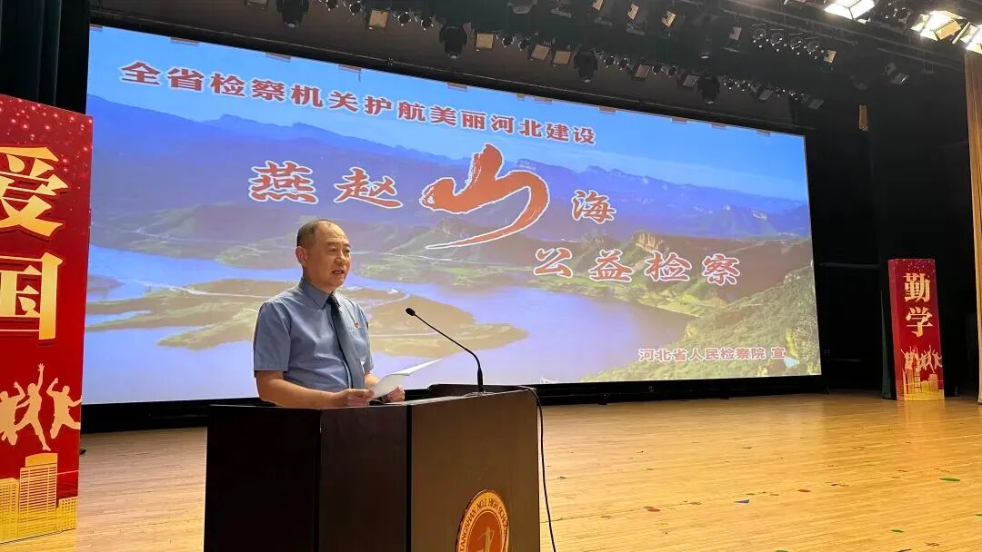 与以往不同的,在今年的“开学第一课”中,“燕赵山海·公益检察”的宣讲成为重头戏。作为该校的法治副校长,贾志宏从近年来出现的生态环境、食品药品等与民生息息相关领域的矛盾问题入手,介绍了公益诉讼检察职能,系统讲解了全省检察机关在破坏大气环境、破坏水环境、破坏土壤环境、破坏生态资源等四个领域开展“燕赵山海·公益检察”。同时,以视频的形式为同学们展示了唐山市检察院办理的 “无人打捞的沉船”海洋生态保护民事公益诉讼案的办案过程和成效,让同学们更加深刻地了解检察机关在“燕赵山海·公益检察”中所承担的检察责任和在生态环境保护和美丽河北建设中承担的社会责任。此外,他还介绍了 “燕赵山海•公益检察”开展以来检察机关作出的努力和取得的成效,鼓励同学们生逢盛世,既是法治的受益者,也要做法治的倡导者和建设者。