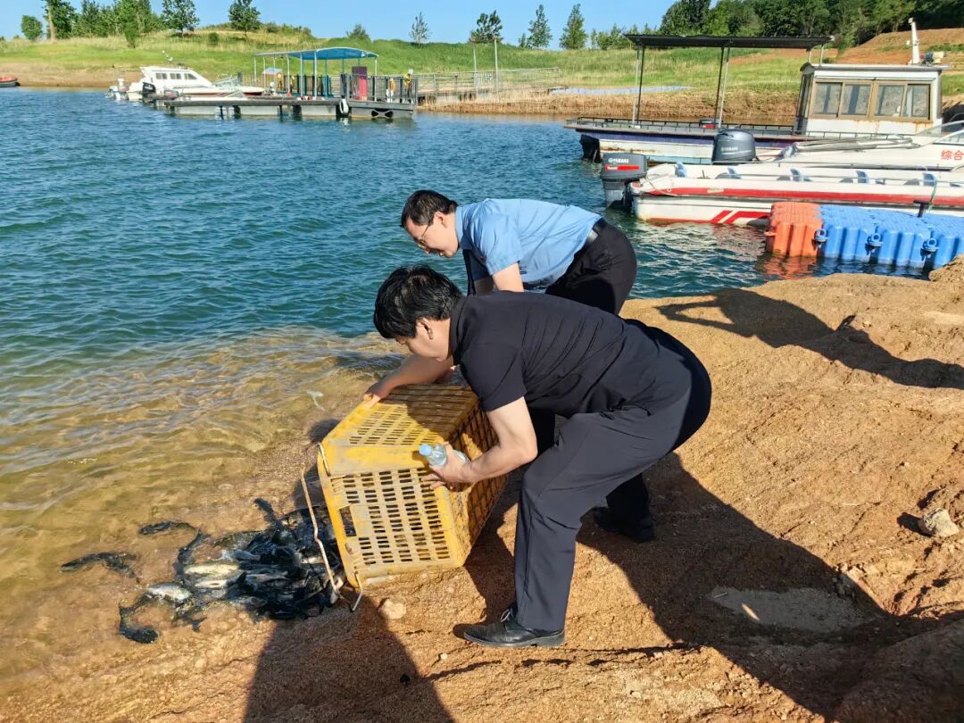 平山县检察院联合县农业农村局、县公安局到岗南水库开展增殖放流活动。