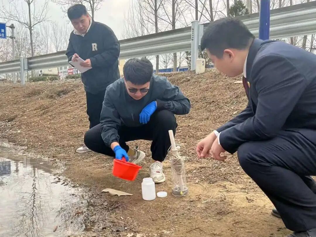 图为廊坊市永清县检察院工作人员在田间现场收集水样。